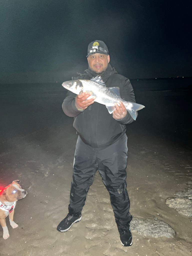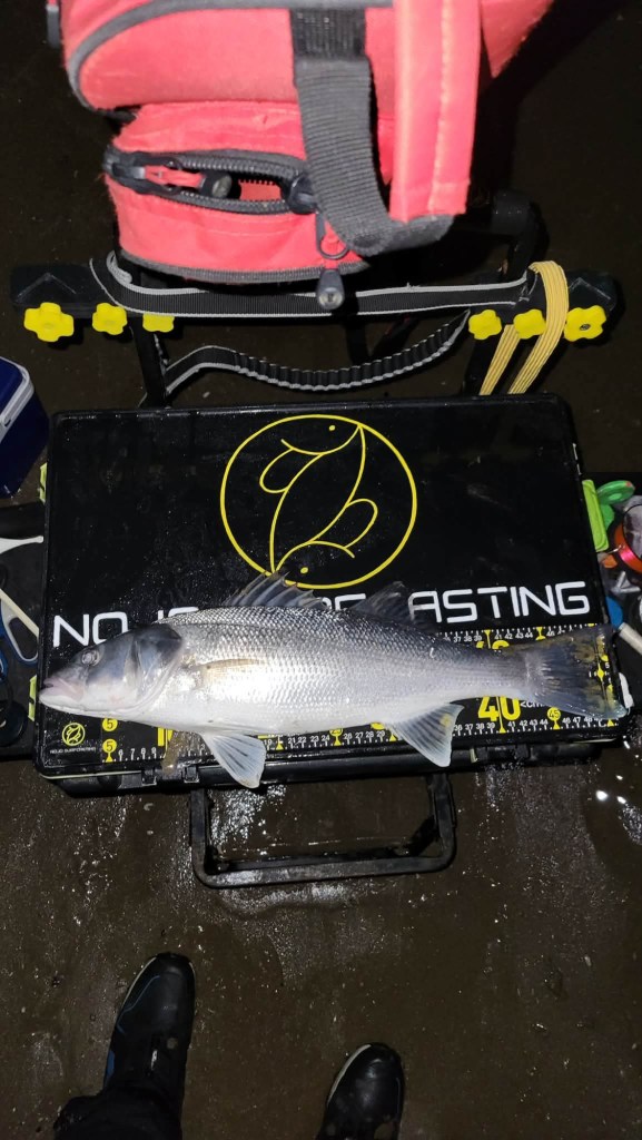 Par contre sans ma ligne , du coup je vais sur ma canne prends contact et ferre, c’est pendu, il y’a du poids , de bon coup tête aussi , la un jolie labrax de 54cm qui sortira de l’eau. Ça fait même pas 1h30 les cannes l’eau et déjà 4 poissons qui sont répartis dans leur élément.