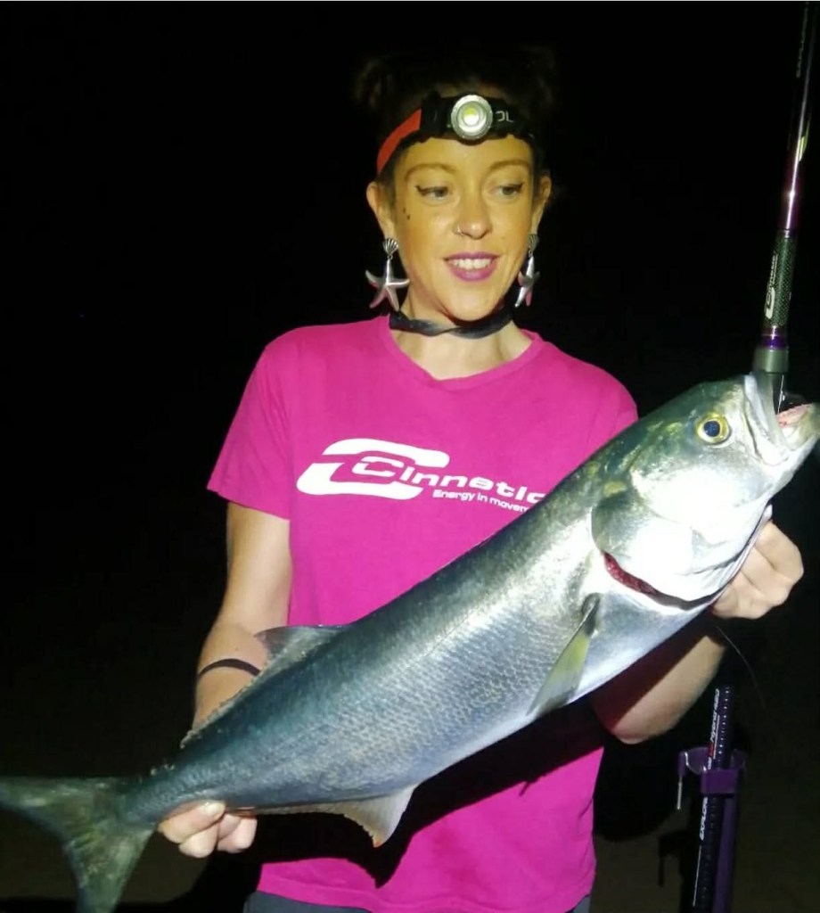Elle utilise des cannes de 4,20 m, souvent hybrides, avec des puissances de 110 à 225 g. Ses montages sont adaptés aux conditions, notamment avec des urfes, et elle privilégie des appâts comme le mulet vivant ou la seiche.