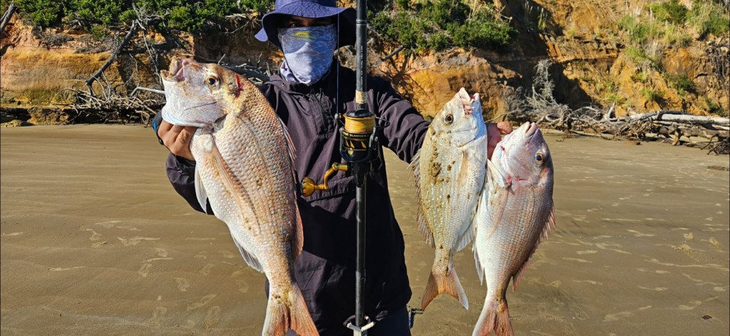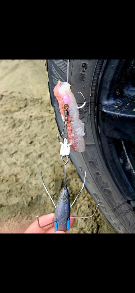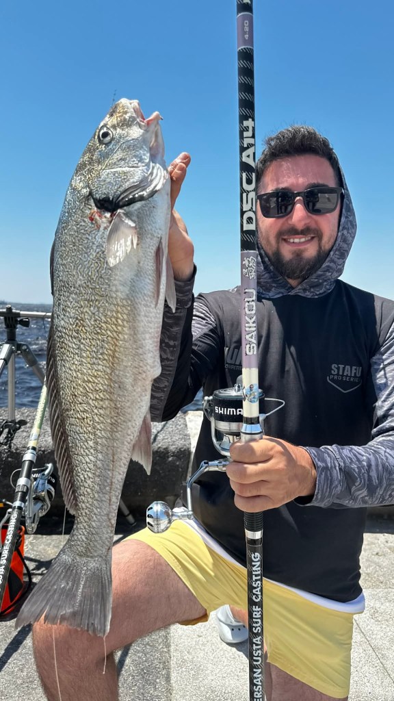Pour faire face à ces conditions, son équipement reste polyvalent : il utilise des cannes de 3,60 à 4,20 m, avec une action plutôt puissante, associées à des moulinets de taille 5000 à 12000. Il pêche aussi bien en tresse (15 à 25 lb) qu’en nylon (20/100 à 50/100), avec un shock leader pouvant atteindre 70/100. Ses montages sont simples, généralement à 1 ou 2 hameçons, avec des plombs pyramide ou à grappin pour tenir dans le courant. Côté appâts, il s’adapte avec des crevettes, de la sardine, du calamar ou des coquillages.