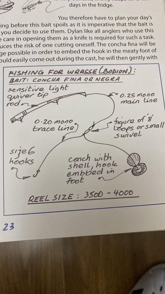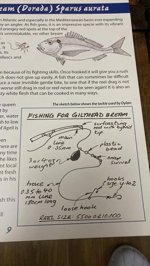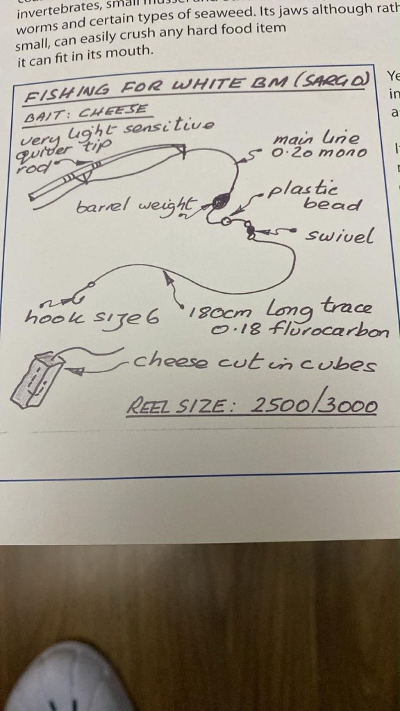 Sa pêche est plus légère, plus précise. Il utilise des cannes de type ledgering, capables de lancer entre 60 et 160 g, avec des plombs souvent compris entre 80 et 100 g. Mais ce qui marque surtout, ce sont ses approches : il peut utiliser une palourde ouverte comme appât, ou même du fromage Edam pour cibler le Sar.